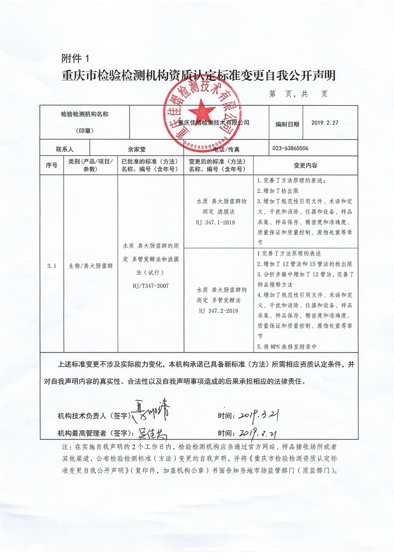 為貫徹落實《重慶市市場監(jiān)督管理局關(guān)于推行檢驗檢測機(jī)構(gòu)資質(zhì)認(rèn)定標(biāo)準(zhǔn)變更模式改革試點的通知》(渝市監(jiān)發(fā)〔20194號)精神,現(xiàn)將本公司水質(zhì) 糞大腸菌群的測定標(biāo)準(zhǔn)變更聲明如下: